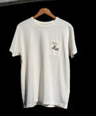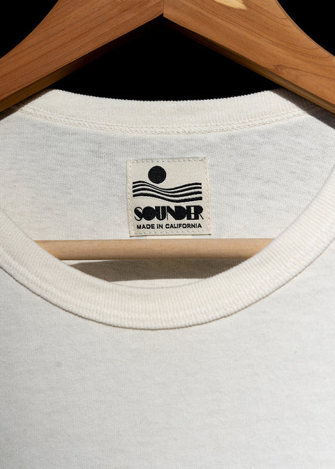 MADE OF MIDWEIGHT S.6 oz.100% COTTON JERSEY THE FABRIC IS SOFT, STURDY AND HARD WEARING SOUNDER 'LANDSCAPE' SCREEN PRINT ON POCKET DOUBLE NEEDLE BOUND COLLAR AND BLIND STICHING AT HEM AND SLEEVES FOR VINTAGE VIBES CUSTOM INSIDE NECK LABEL